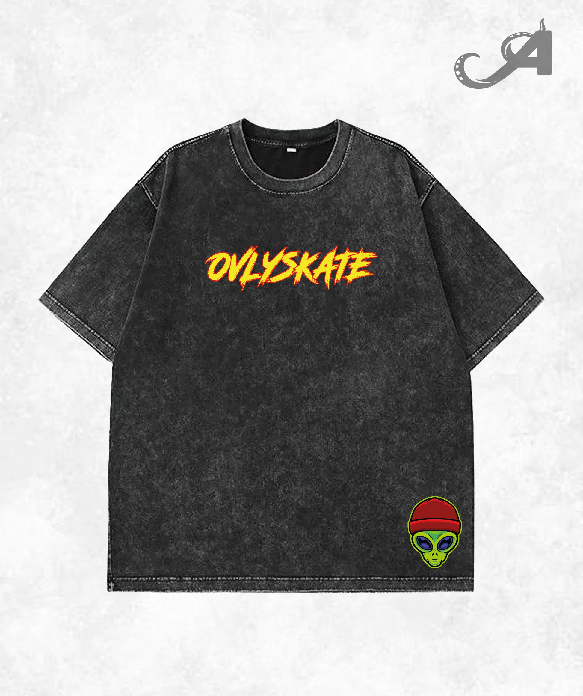 Ce t-shirt noir délavé "Alien Skater Party" est parfait pour ceux qui aiment l'humour noir et la culture skate. L'imprimé au dos met en scène un extraterrestre déjanté, prêt à faire la fête et à démolir le système, avec une planche de skate surdimensionnée et des gobelets rouges.