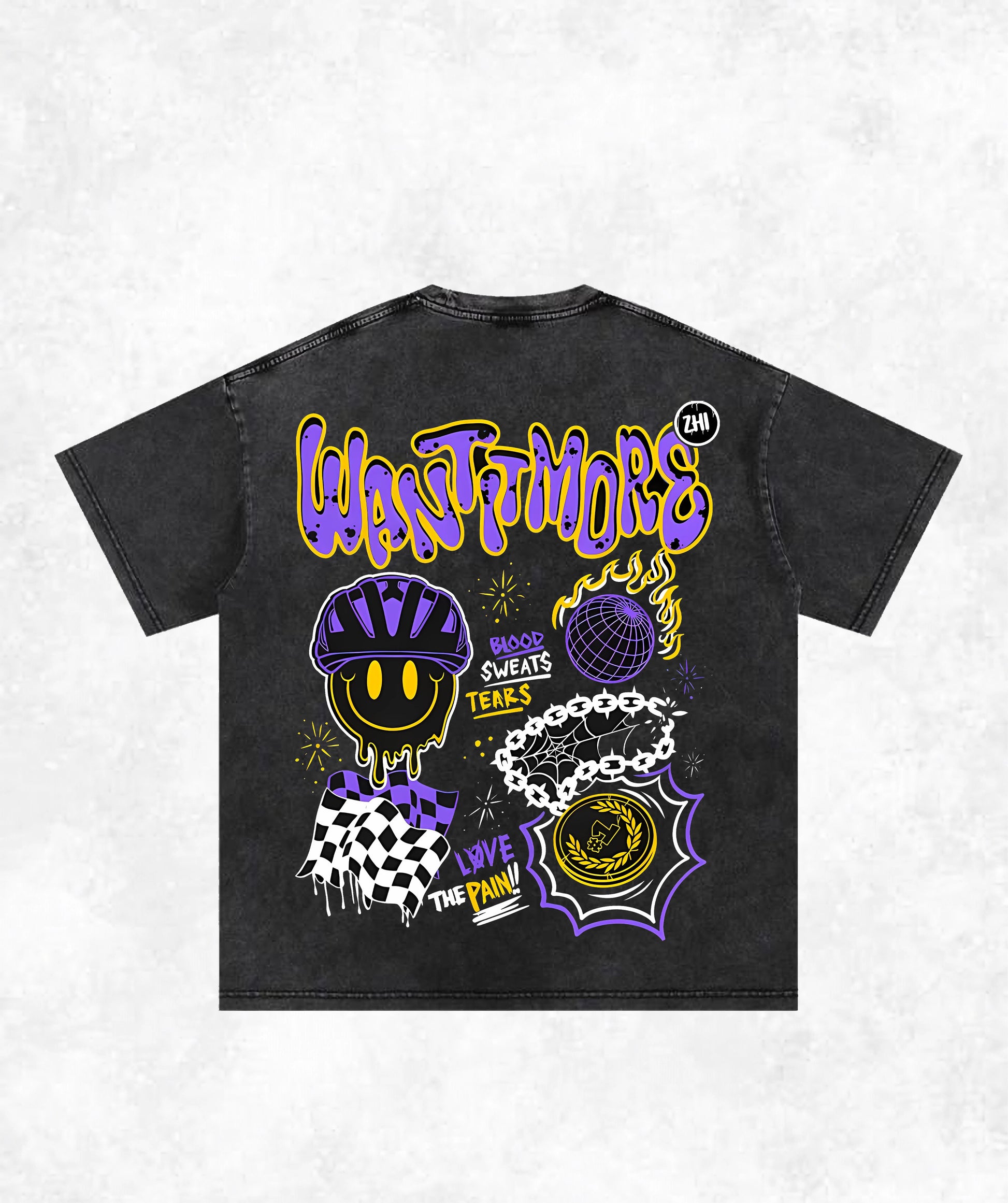 This t-shirt features a dynamic, bold graphic on a high-quality acid-washed fabric. The back of the shirt is a collage of unique designs, including a stylized smiley face, a checkered flag, and the phrase "WANT MORE." This shirt is for those who love streetwear and want a statement piece that is both professional and expressive.